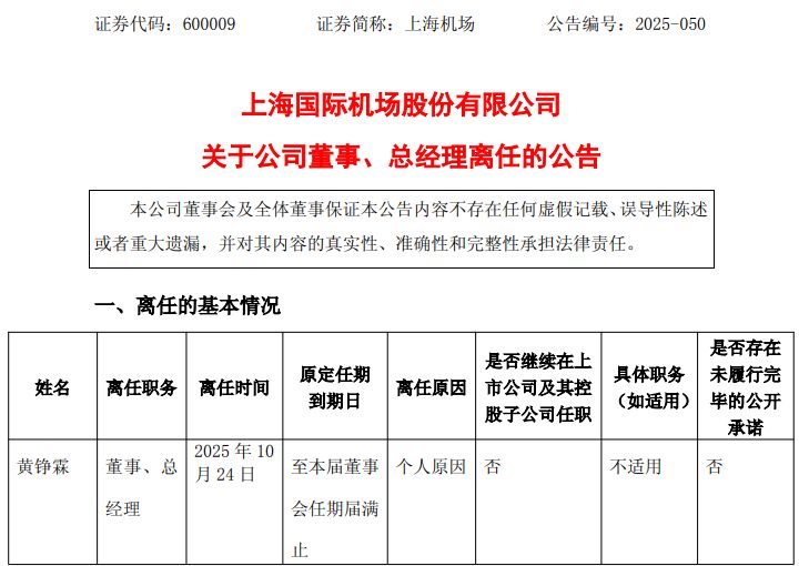 10月24日晚间,上海国际机场股份有限公司(上海机场,600009.SH)发布公告称,董事、总经理黄铮霖因个人原因,申请辞去公司董事及董事会专门委员会委员、总经理职务。辞职后,黄铮霖无在公司及其控股子公司任职情况。