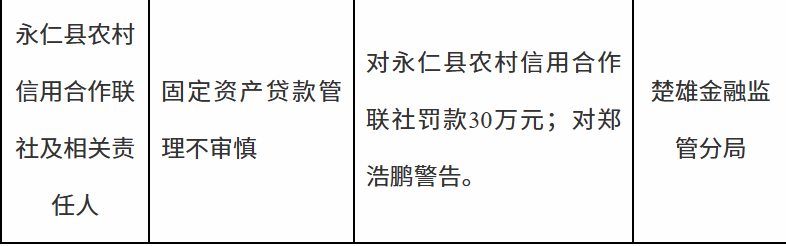 11月19日,楚雄金融监管分局行政处罚信息公示列表显示,永仁县农村信用合作联社及相关责任人因固定资产贷款管理不审慎被罚款30万元;郑某鹏被警告。