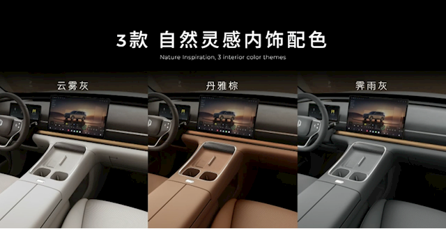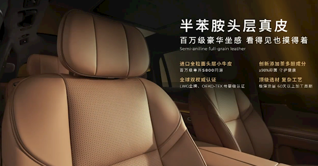 全车软包高达25㎡,采用半苯胺头层真皮,做到了百万级的豪华和舒适;内饰配色有云雾灰、丹雅粽、霁雨灰三种。
