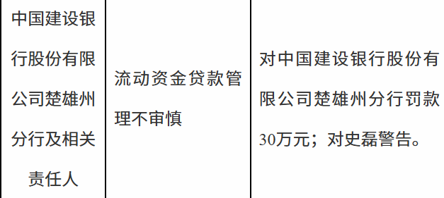 11月19日,楚雄金融监管分局行政处罚信息公示列表显示,中国建设银行股份有限公司楚雄州分行及相关责任人因流动资金贷款管理不审慎被罚款30万元;史某被警告。